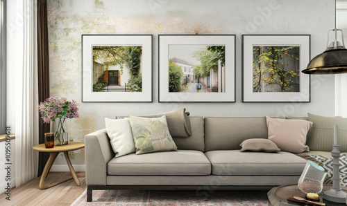 Two beautifully arranged picture frames sit above a cozy sofa in a chic living room. The decor features soft colors and inviting elements, creating a warm atmosphere perfect for relaxation