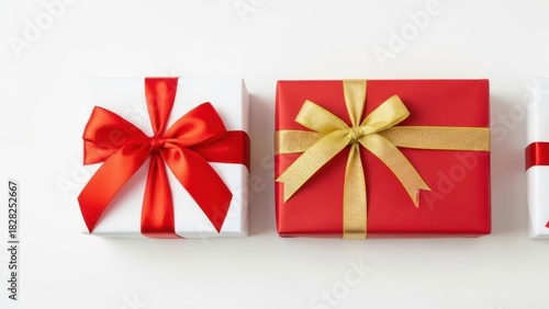 Two beautifully wrapped gift boxes, one white with a red ribbon and one red with a gold glitter ribbon, isolated on white background for holiday celebration or present concept