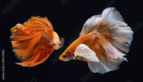 Two Betta fish - one vibrant orange and one white with flowing fins - appear to be facing each other against a dark background.