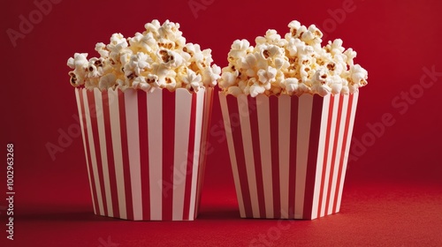 Two boxes of popcorn sit against a red backdrop.