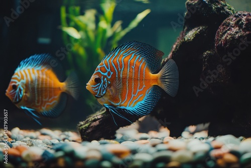Two brightly colored fish swimming in an aquarium habitat