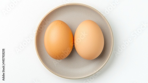 Two brown eggs placed side by side on a simple beige plate against a white background.