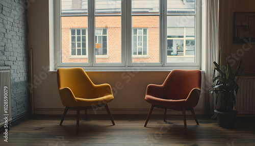 Two chairs positioned in front of a window, suggesting a cozy sitting area in a minimalist setting.