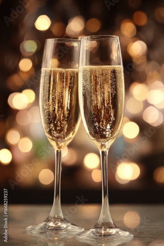 Two Champagne Flutes with Bubbles and Bokeh Lights Background