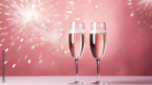 Two champagne glasses on a pink background with fireworks and copy space, Generative AI
