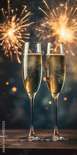 Two Champagne Glasses On Grey Background Of Fireworks With Empty Space. Birthday Celebration. Generative AI