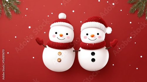 Two cheerful snowmen with red hats and scarves on a red background, surrounded by snowflakes and pine branches.