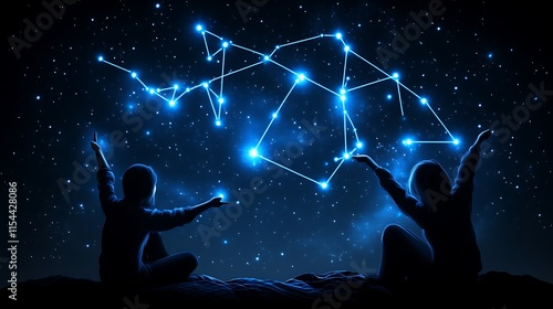 Two children marvel at a night sky constellation.