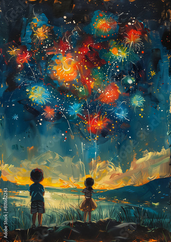 two children watching fireworks sky oil girl wow cheerful color