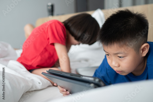 two chinese children addicted tablet, asian child watching telephone together on their bed, kid using smartphone