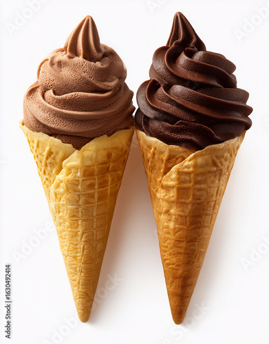 Two chocolate soft serve ice cream cones dessert