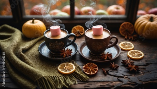 Two coffee cups, meringue cookies, pumpkins, apples, leaves, plaid against a window backdrop, concept of home comfort, seasonal theme