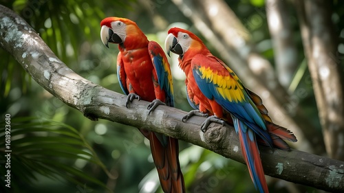 Two colorful scarlet macaws perched on a tree branch in a lush jungle