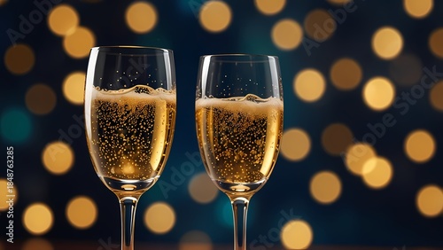 Two crystal flutes of bubbly champagne with golden liquid and rising bubbles toast against a black background to celebrate a New Year Eve party or a holiday anniversary celebration