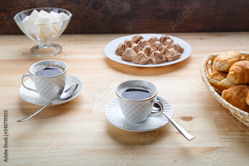 Two cups of coffee on a wooden table with croissants and sugar.