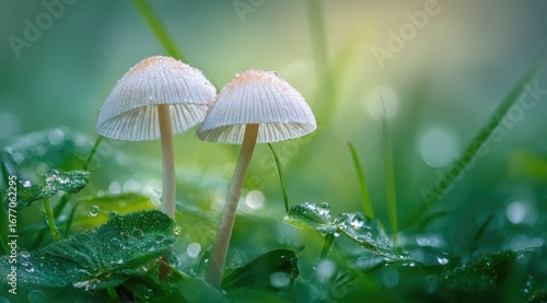 Two delicate white mushrooms stand amidst dewy clover leaves. Soft, diffused light bathes the scene in a gentle glow