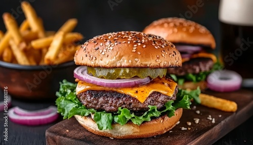Two Delicious Cheeseburgers With Fries, Pickles, Onions, And Cold Beer On Wooden Board