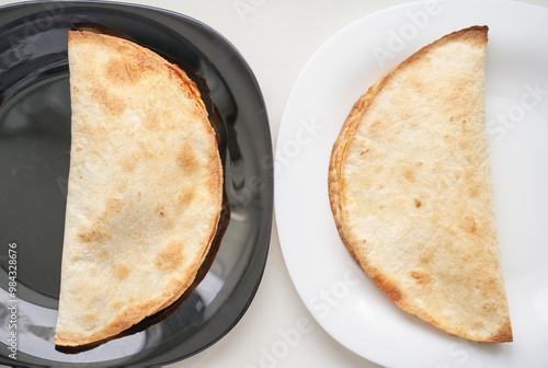 Two delicious quesadillas on black and white plates showcasing contrasting presentation styles.