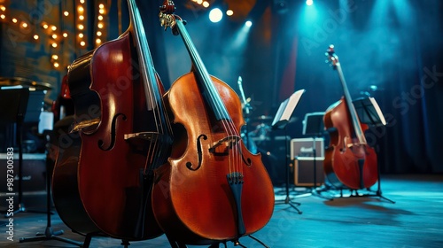 Two double basses stand on a stage with their backs to the camera under a spotlight with a blurred third double bass in the background.