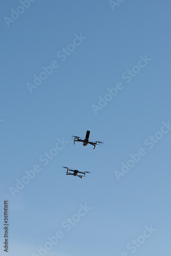 Two drones racing in the sky.