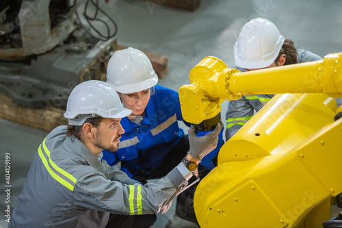 Two engineer in uniform helmet inspection check control heavy machine robot arm construction installation in industrial factory. technician worker check for repair maintenance electronic operation