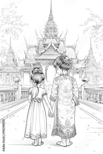 Two Figures in Traditional Attire Walk Towards an Ornate Asian Temple in a Pen and Ink Sketch Style