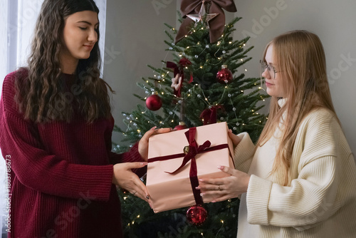 Two friends exchanging a beautifully wrapped gift in front of a Christmas tree