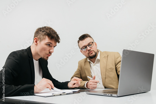 Two generalist business analysts discuss data management using computer. Conceptual consulting, training and customer support using online technology during an office meeting.