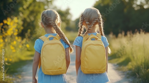 Two girls with yellow backpacks walking on a sunny path surrounded by nature.
