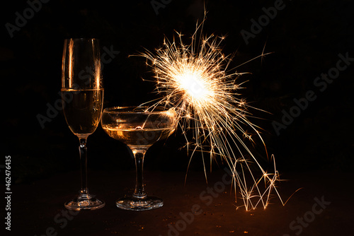 Two glasses of champagne with sparklers on a dark background, holiday and Christmas concept.