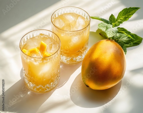 Two glasses of mango iced tea, garnished with mint and mango slices