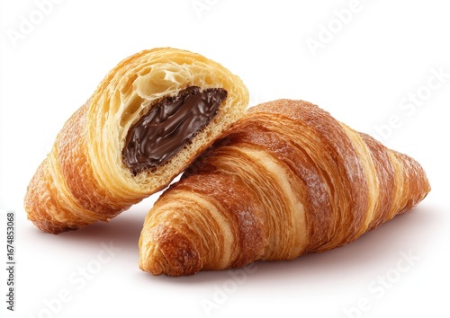 Two halves of a chocolate-filled croissant, golden-brown pastry with a rich chocolate filling, isolated on a white background