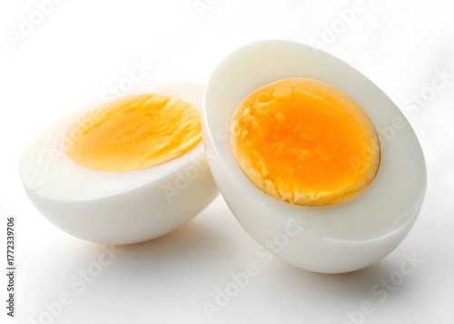 Two halves of a cooked egg, one slightly angled. Vivid yolk and white against white background