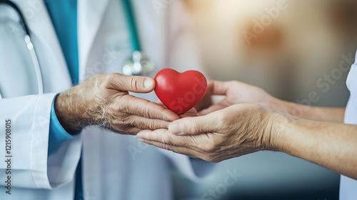 Two hands exchanging a red heart symbol, representing care, compassion, and the connection between healthcare providers and patients.