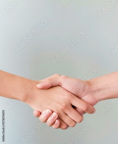 Two hands shaking on light gray background, symbolizing friendship, cooperation, and trust
