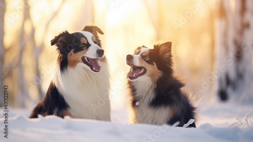 Two happy australian shepherd dogs playing in the snow in a beautiful winter landscape at sunset
