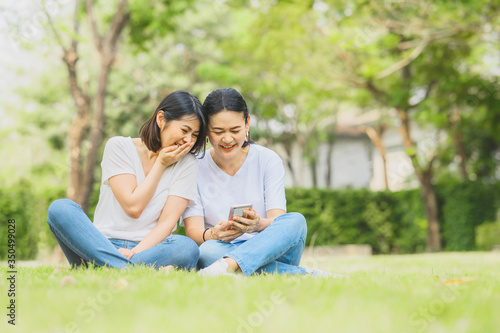 Two happy best friends Asian women are laughing while using mobile smartphone outdoor in the park