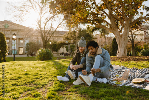 Two men sitting on a blanket and tying shoelaces on their sneakers, at a picnic