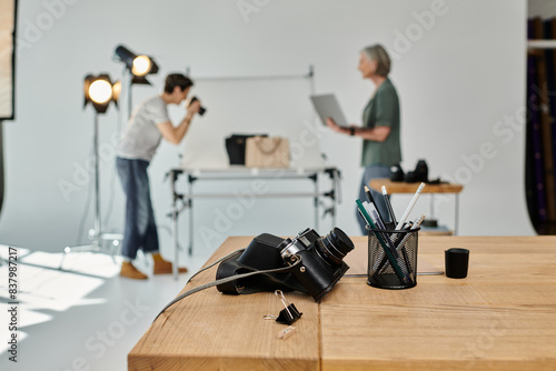 Two middle-aged women, collaborating on a creative project in a professional photo studio setting.