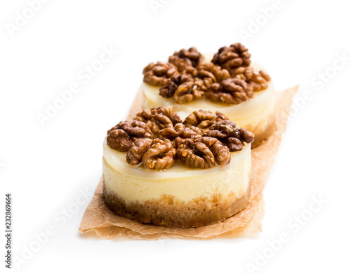Two mini walnut cheesecake isolated on white