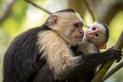 Two monkeys interact in a lush forest, showcasing affection and tenderness during a warm afternoon