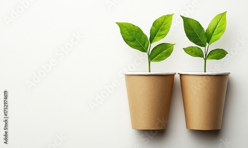 Two paper cups with vibrant green seedlings symbolizing sustainability and eco-friendly practices