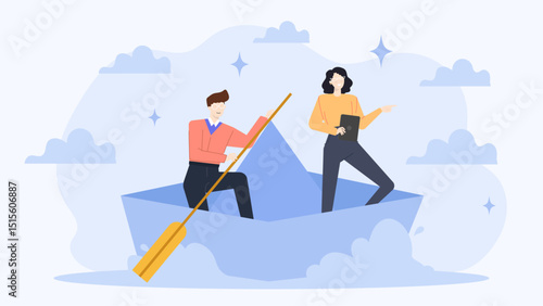 Two people in a paper boat with an oar. Suitable for adventure, friendship, teamwork concepts in design, social media, and print.