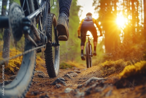 Two people mountain biking on rugged forest trail. Sunlight filters through trees. Action shot. Adventure outdoor cycling in nature. Focus on wheels, legs. Exciting moment. Perfect for eco tourism,