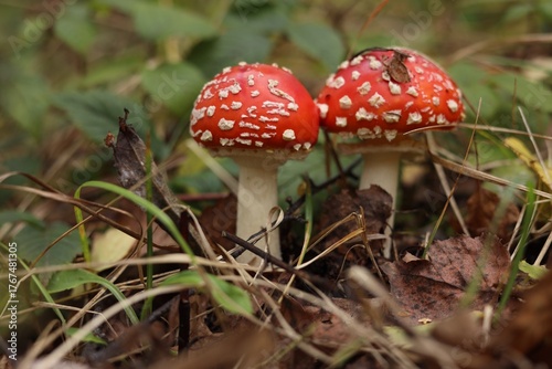 Two poisonous mushrooms growing in forest, closeup
