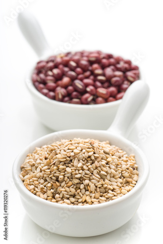 two porcelain bowls with sesame seeds and azuki isolated