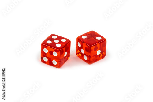 Two red glass dice isolated on white background. Five and two.