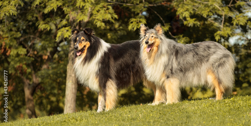 two rough collies standing in a park