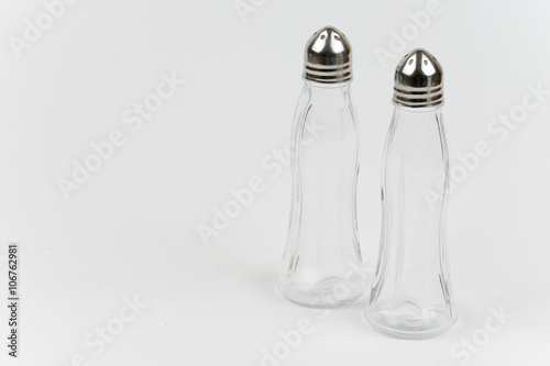 Two saltshakers on a white background