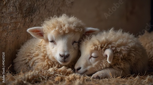 Two sheeps babies sleeping leaning against each other.generative.ai